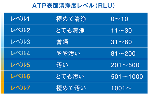 ATP測定は、汚染物質(=ATP値)を測定する検査で、数値が少ないほど感染のリスクが下がります。約30秒で結果が得られるので、その場で衛生状態を見ることができ、清浄度検査として最も支持されている検査方法で、「食品衛生検査指針微生物編」(厚生労働省監修)に掲載されている公式機関が認めた検査です。